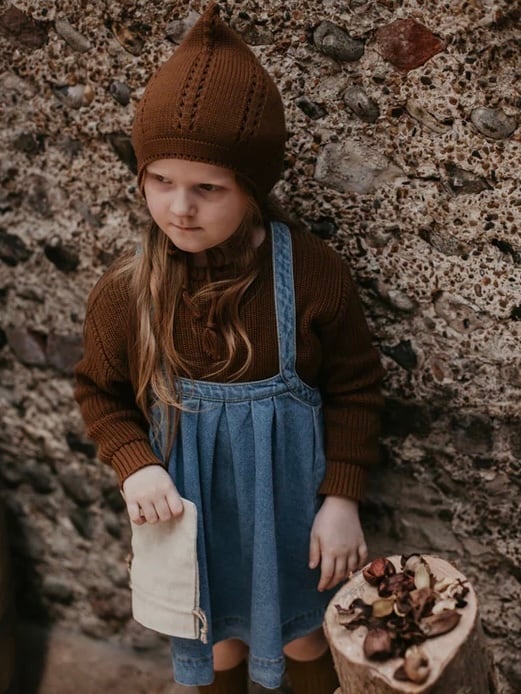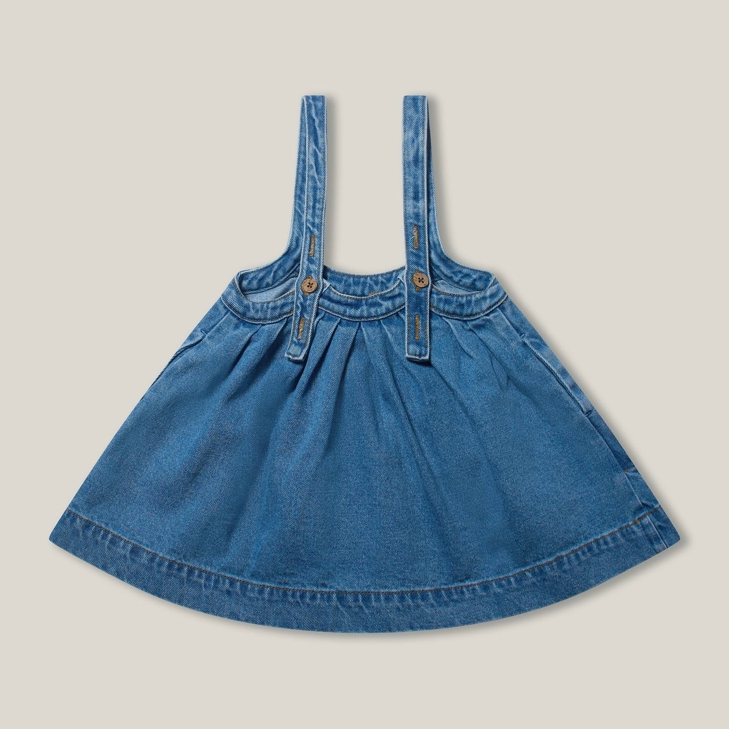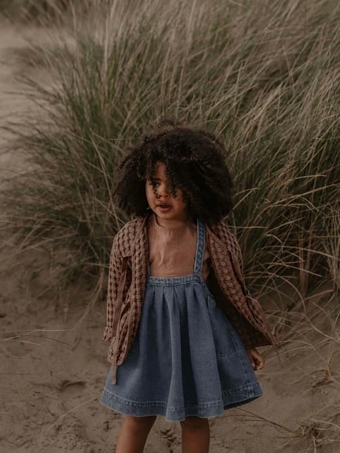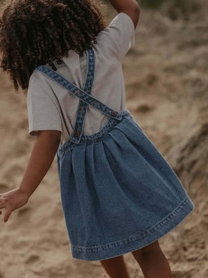 軽やかなデニムで仕立てたピナフォア。快適でカジュアル、それでいてさりげなくおしゃれな一枚です。ゆったりとしたシルエットは、ダンスやくるくる回る遊び、子どもたちの自由な冒険を思いきり楽しめるよう丁寧に作られています。