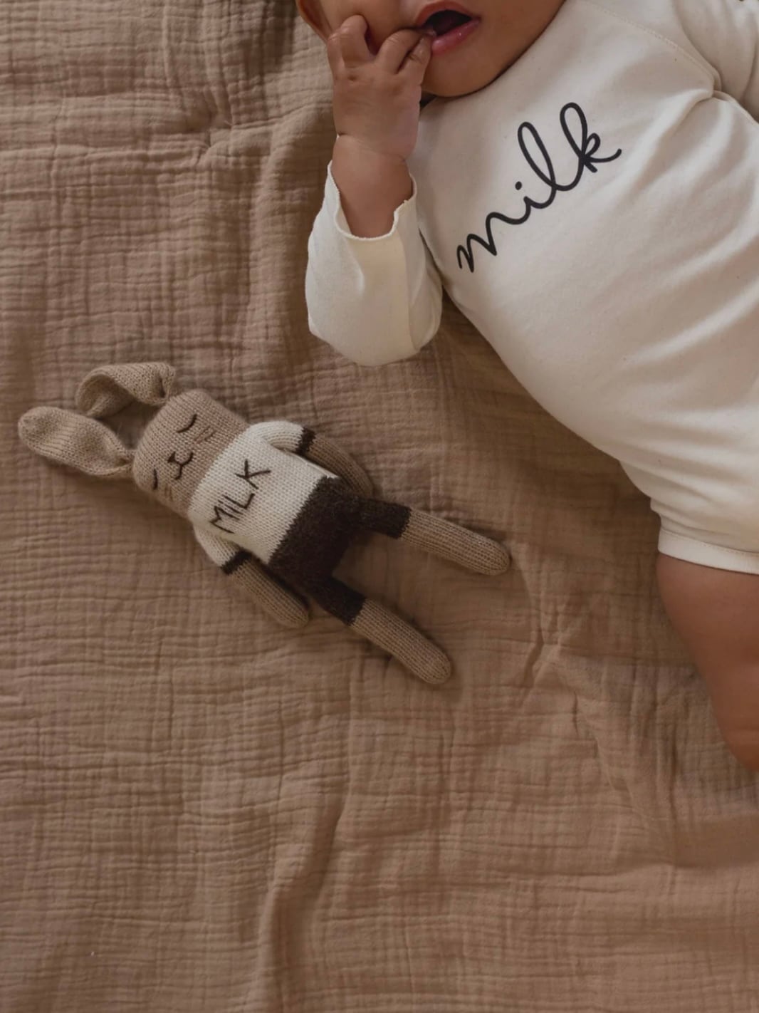 ひとつひとつ丁寧に手編みされたやわらかなニットバニー。クラシックなO~Z Milkをまとい、お子さまの心強い相棒になってくれます。Main Sauvageとのコラボレーションで誕生した、Organic Zooトイファミリーの特別な仲間です。