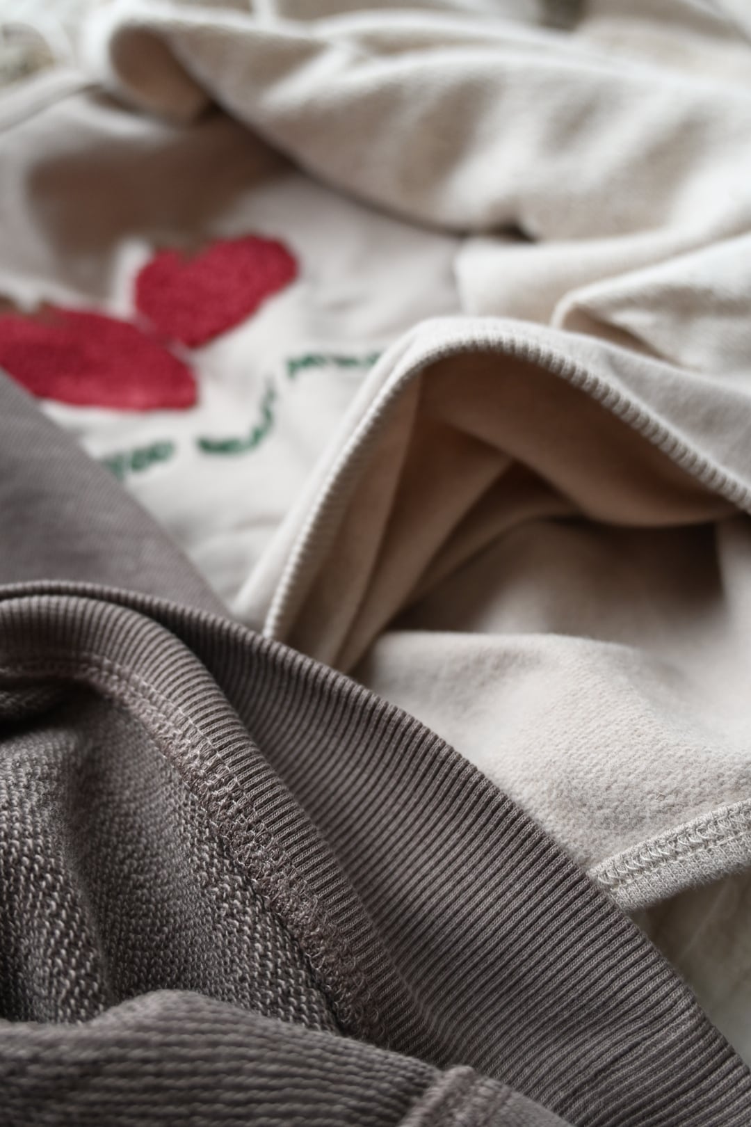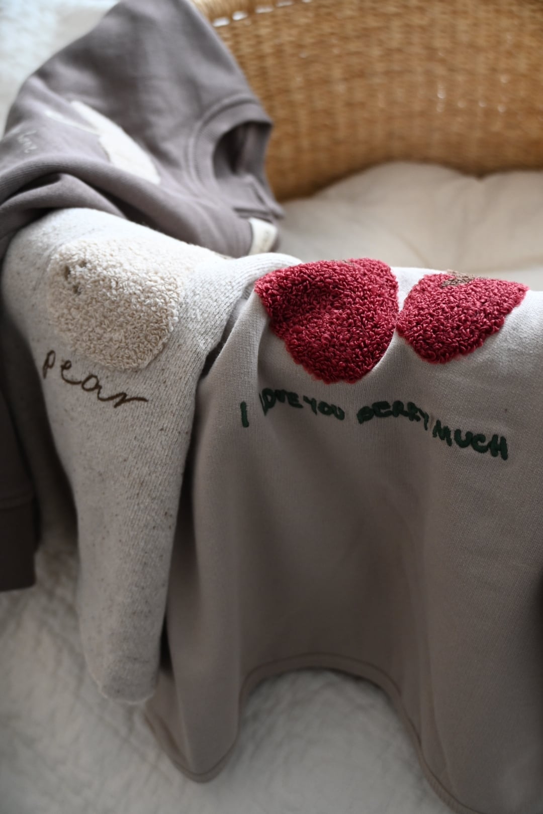 かわいいラズベリーの刺繍と「I love you berry much」の文字が目を惹くスウェットシャツ。very muchとberry muchがかけられたユーモア溢れるデザイン。