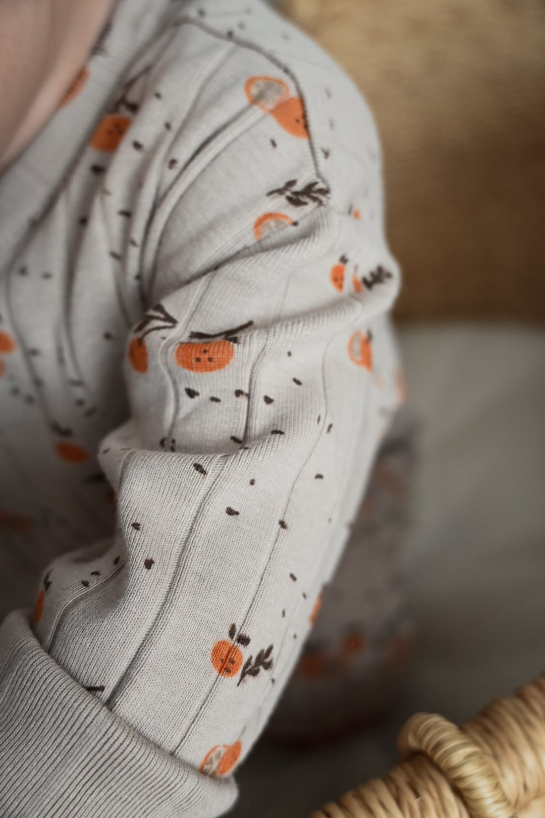 やわらかなリブジャージー素材に、かわいいミニみかん柄がプリントされたロンパース。