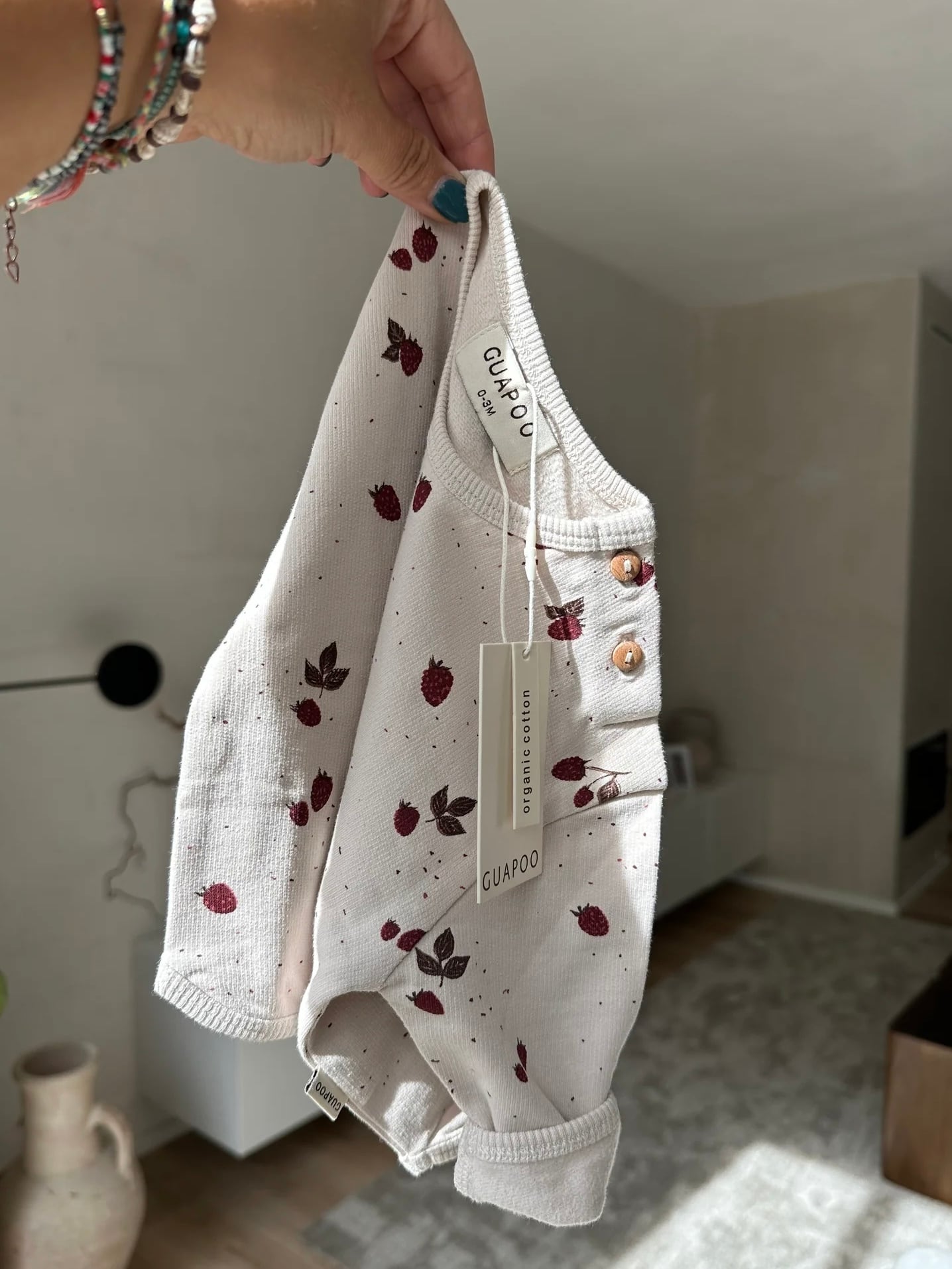 かわいいミニラズベリー柄のスウェットシャツ。内側はふんわり起毛で、赤ちゃんにも心地よい着心地です。襟元の小さな木製ボタンが2つ付いているので、着脱も簡単。