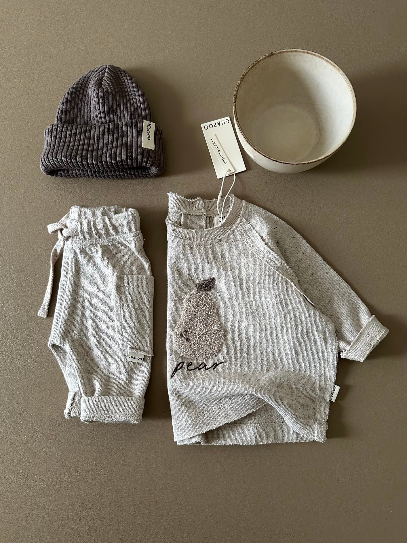 やわらかなオーガニックコットン製のスウェットシャツ。ふんわりした洋ナシの刺繍と、背中に「You are Perfect」の元気なプリントが目を惹きます。perfectと梨のpearがかけられたユーモアあふれるアイテム。