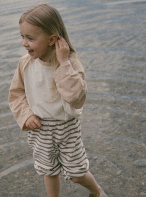 裾は自然にフィットするバンディング仕様で、活動量の多いお子さまでも快適に着用いただけます。全体的にゆとりのあるルーズフィットで、昼寝からお出かけまで一日中ストレスなく過ごせる万能アイテム。
