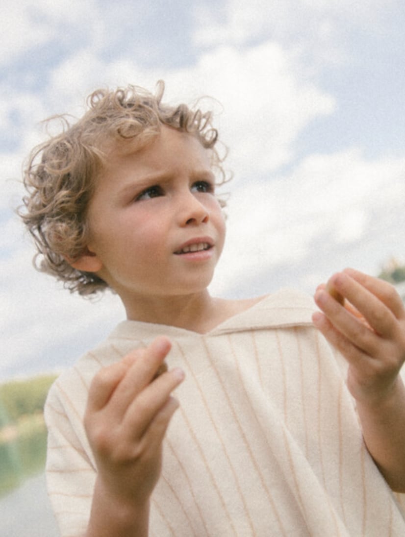 広めのアームホールとゆったりした身幅で、動きの多いお子さまでも窮屈さを感じず快適に着用できます。肩から自然に落ちるシルエットで、ずれ落ちにくいのもポイント。