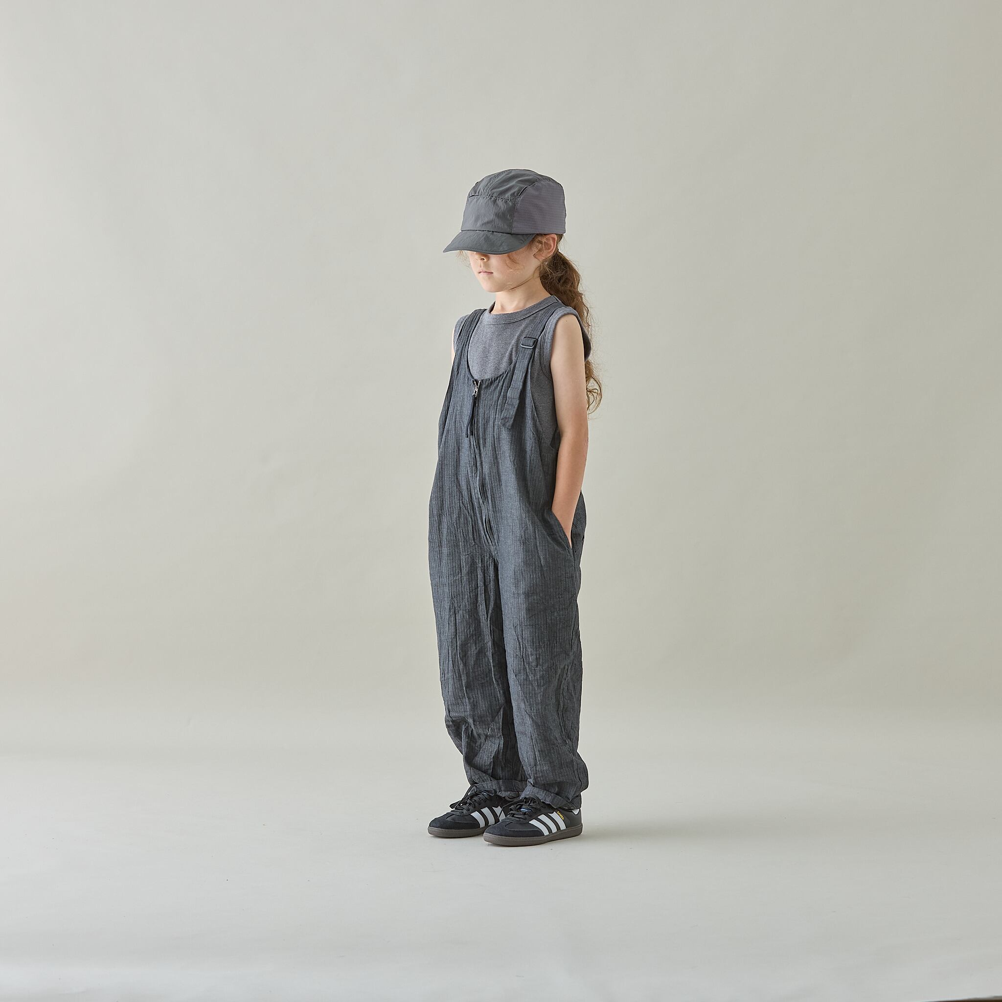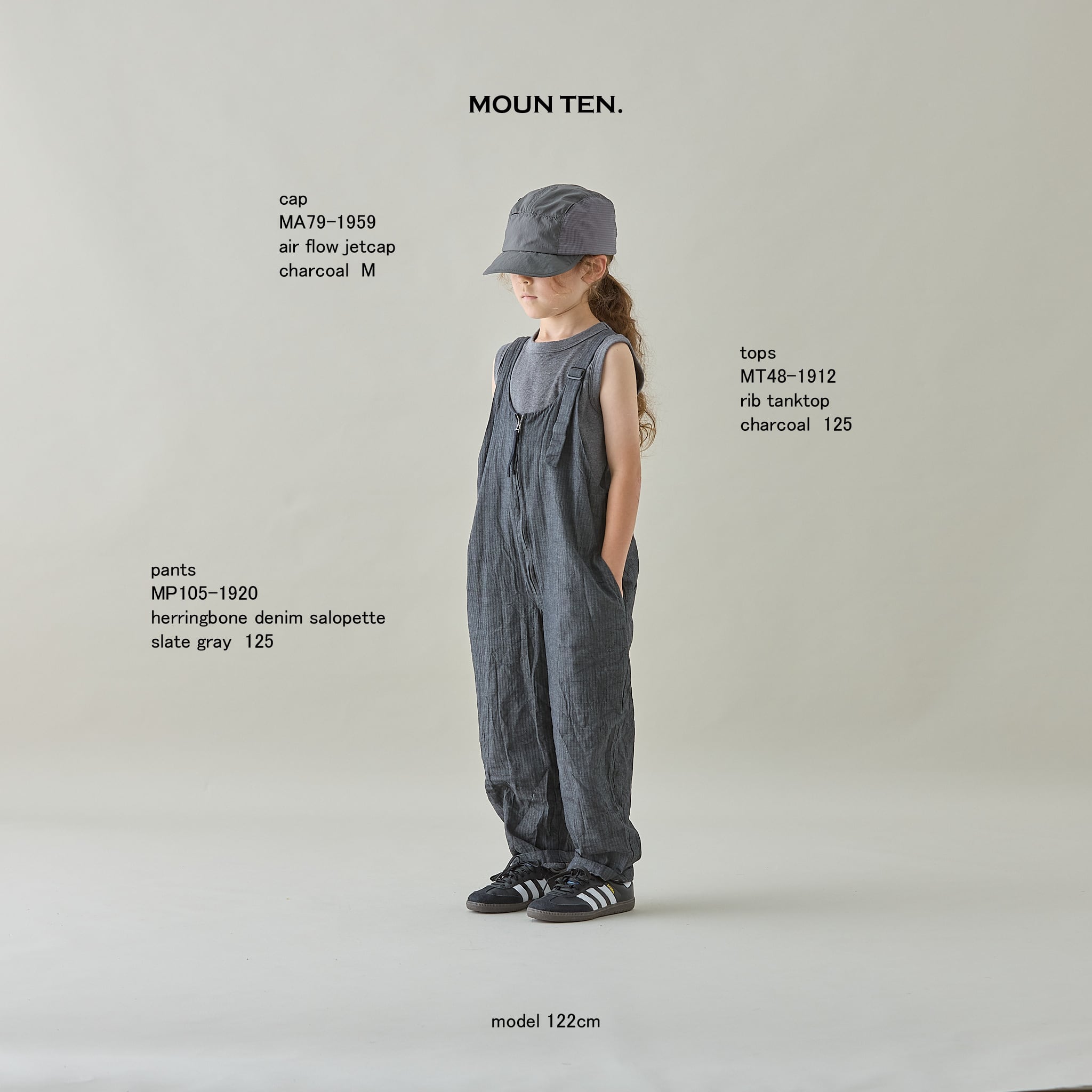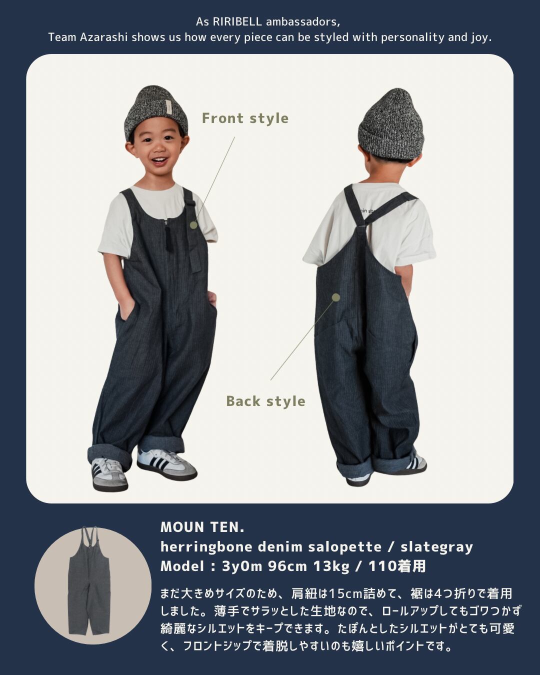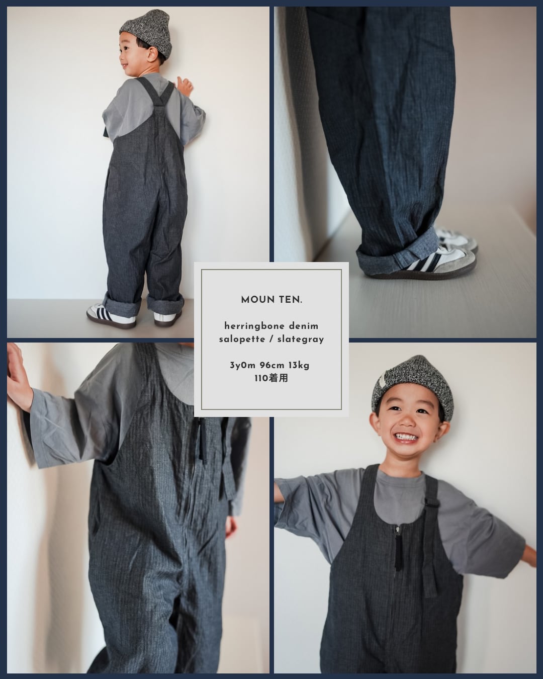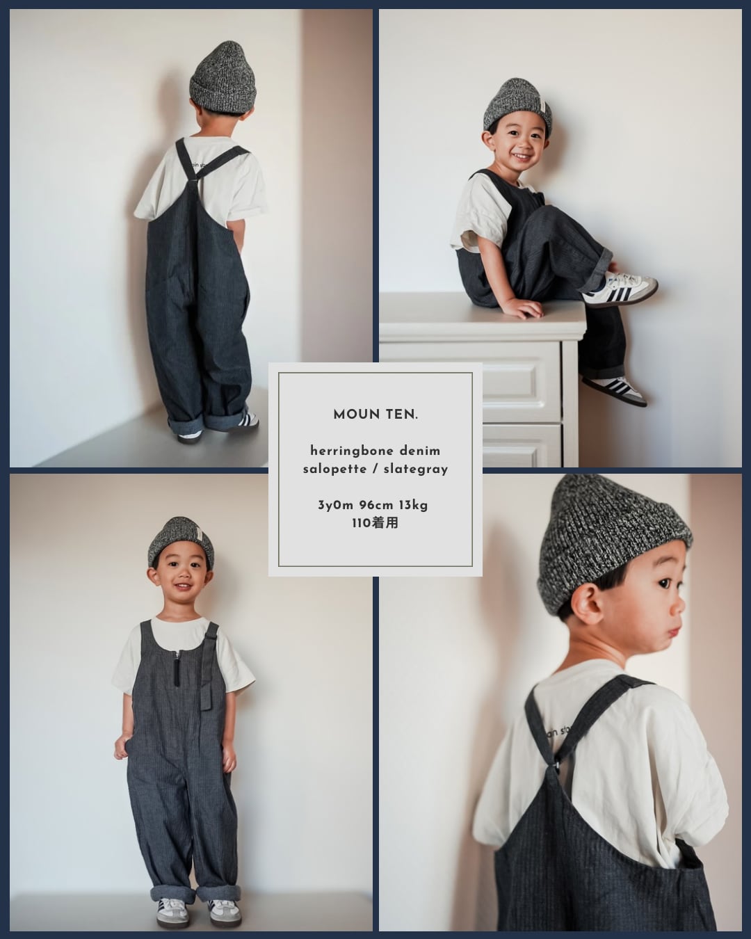 MOUN TEN. のスタイリッシュで人気の定番サロペット。フロントには大きく開くファスナーを採用し、脱ぎ着がしやすい仕様です。左肩のベルトで長さ調節ができ、成長に合わせて着用いただけます。