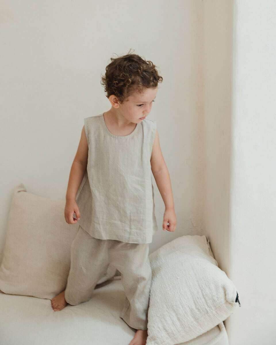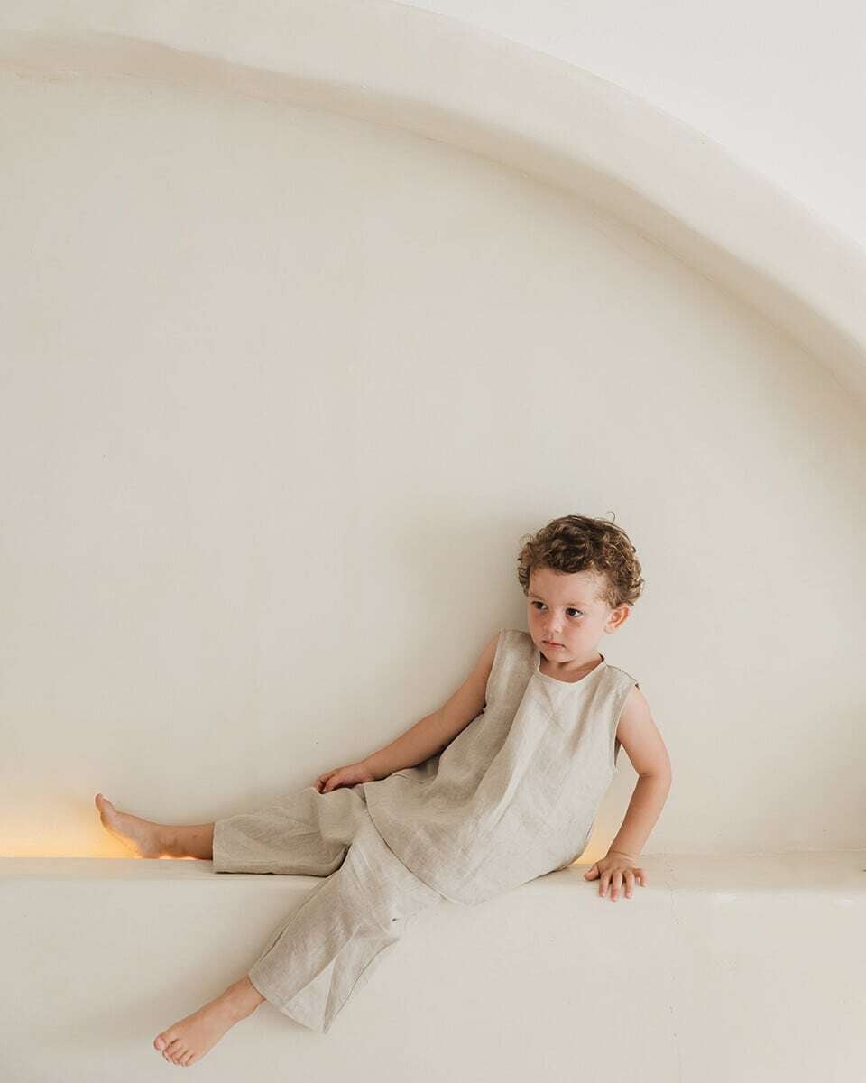 通気性に優れた天然リネン素材で、今季もお子さまを快適に、そしておしゃれに楽しめるセットアップです。