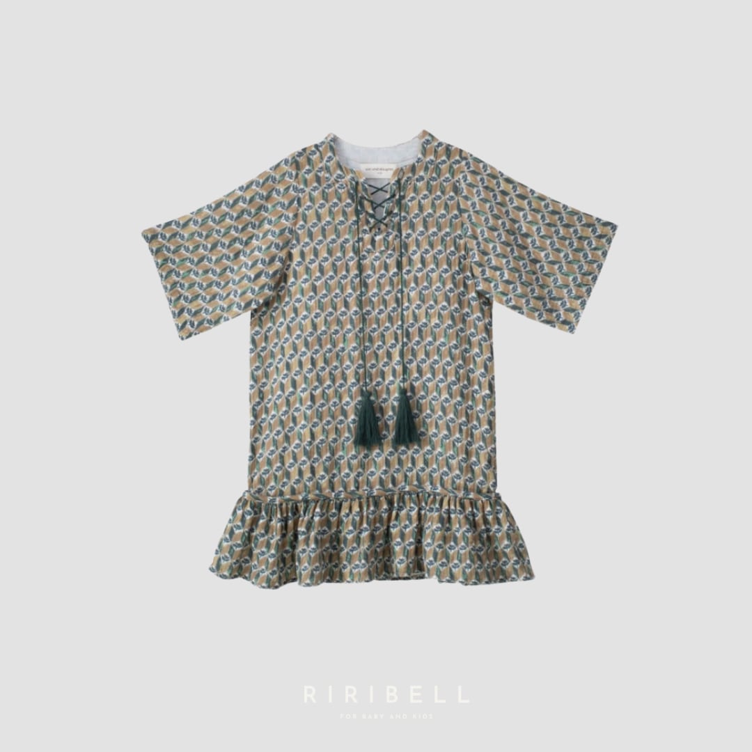 ネックラインには手作業で仕上げたタッセルをあしらい、さりげないアクセントに。ワイドスリーブと裾のフリルが軽やかな動きと上品さを演出します。