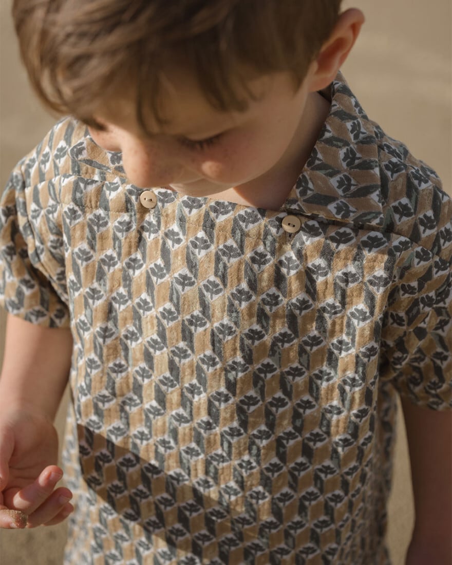ネックラインのウッドボタンが、さりげないハンドクラフト感をプラス。ゆったりとしたシルエットで、動きやすさも◎。総柄には、フランス人アーティザンによるジオメトリックリーフ柄を採用。マスタードイエローと深みのあるグリーンを、伝統的なスクリーンプリントで表現しました。