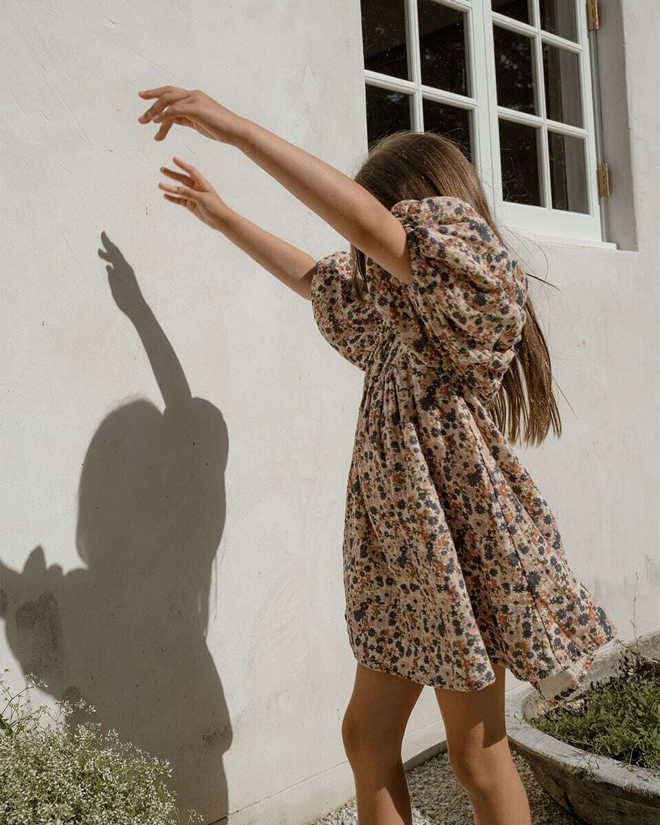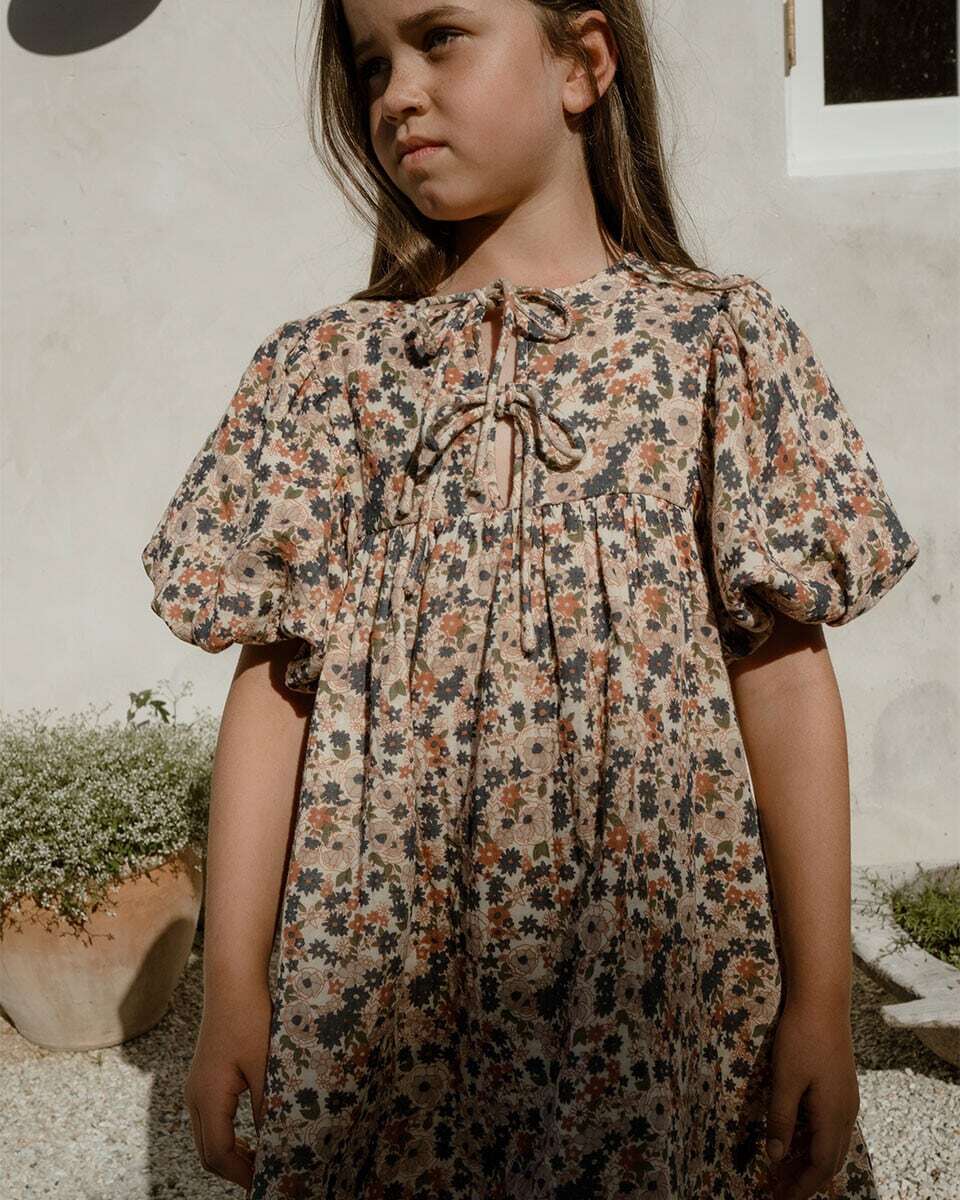 ふんわりとしたパフスリーブとフレアスカートが、軽やかで愛らしいシルエットを描くフローラルミニドレス。フランスのイラストレーターによる描き下ろしのフローラル柄を、温かみのあるヴィンテージカラーで配色し、伝統的なスクリーンプリント技法で仕上げました。素材には、やわらかく肌触りの良いコットン100%のモスリンを使用しています。