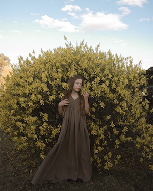軽やかで柔らかな、100%コットンモスリン素材のマキシドレス。繊細なギャザーが美しい流れを生み、動くたびにふんわりと揺れます。