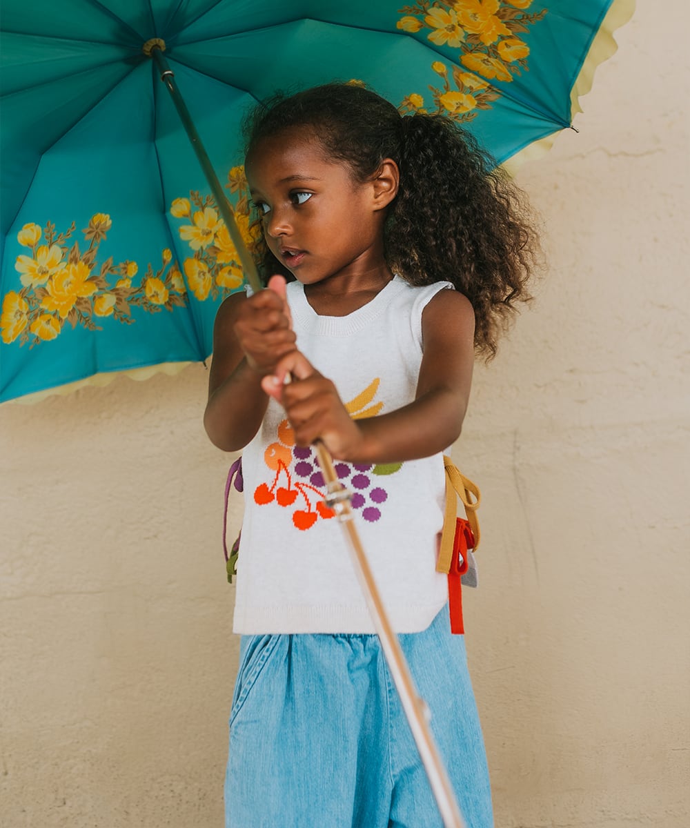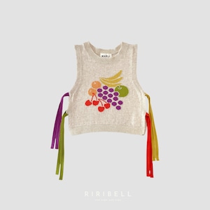 両サイドがオープン仕様になった、軽やかなニットベスト。マルチカラーのリボンで結ぶデザインがアクセントになっています。軽やかな編み地に、遊び心のあるフルーツボウルの柄があしらわれています。