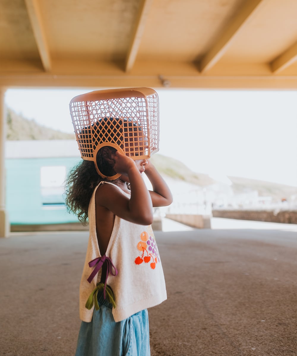 両サイドがオープン仕様になった、軽やかなニットベスト。マルチカラーのリボンで結ぶデザインがアクセントになっています。軽やかな編み地に、遊び心のあるフルーツボウルの柄があしらわれています。