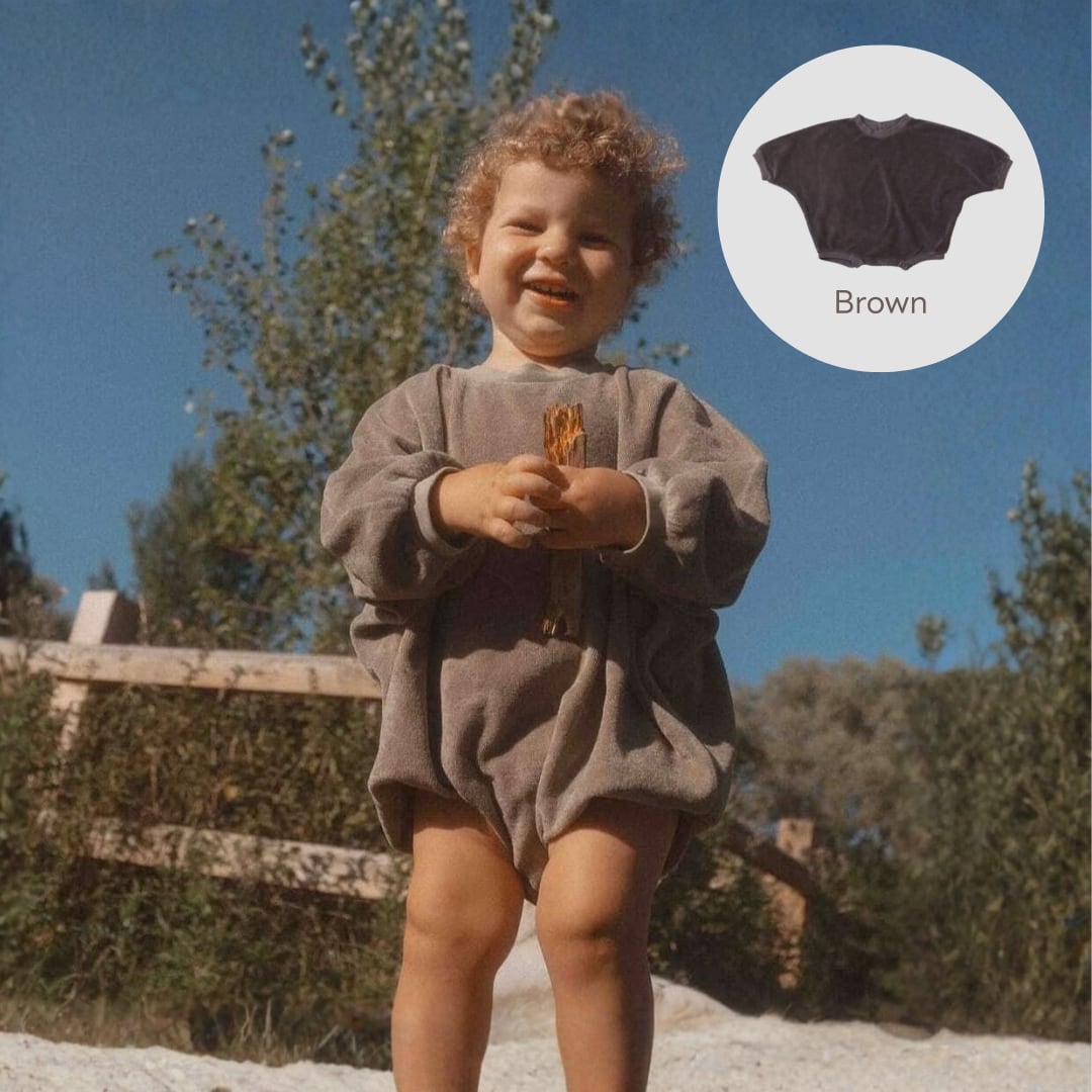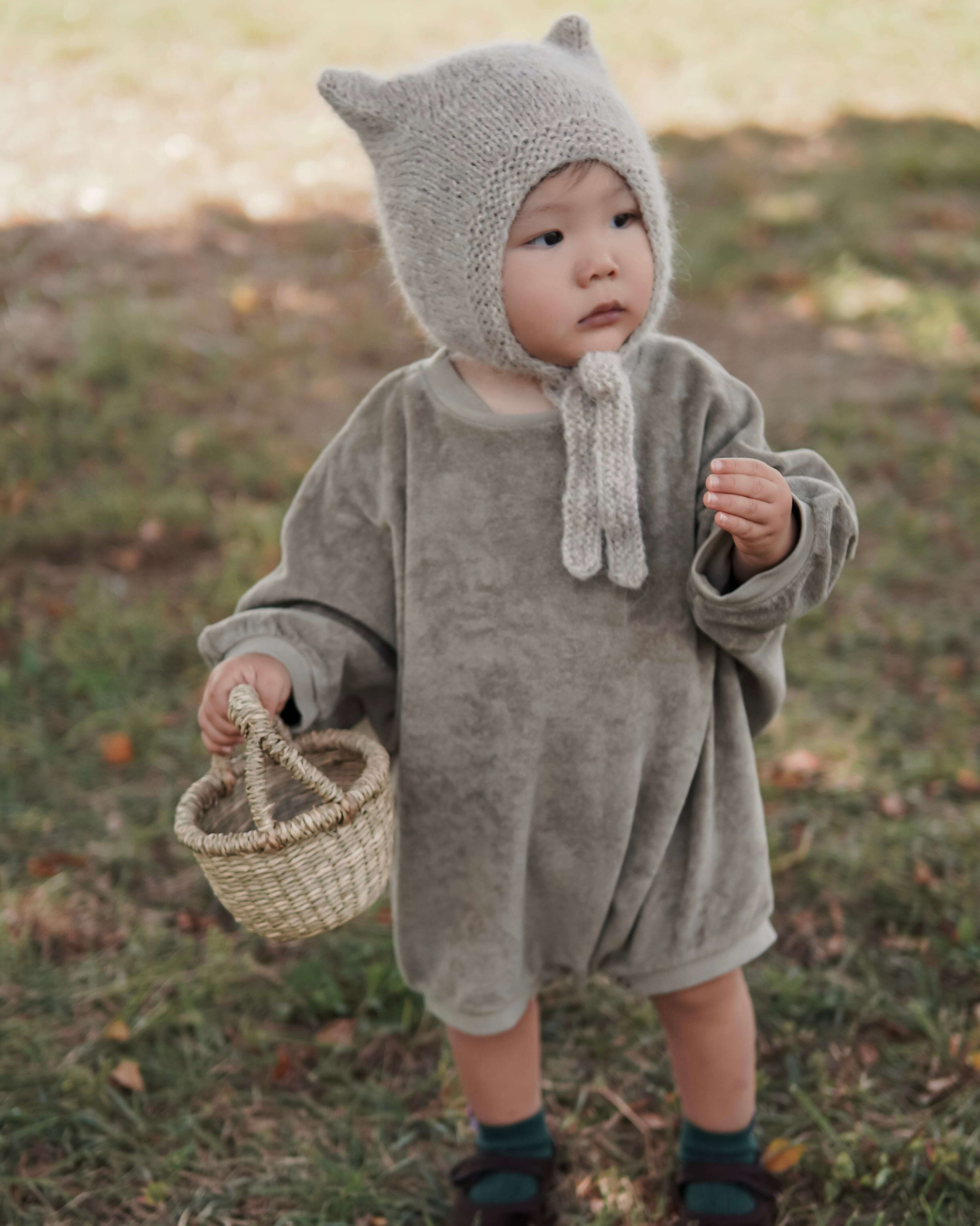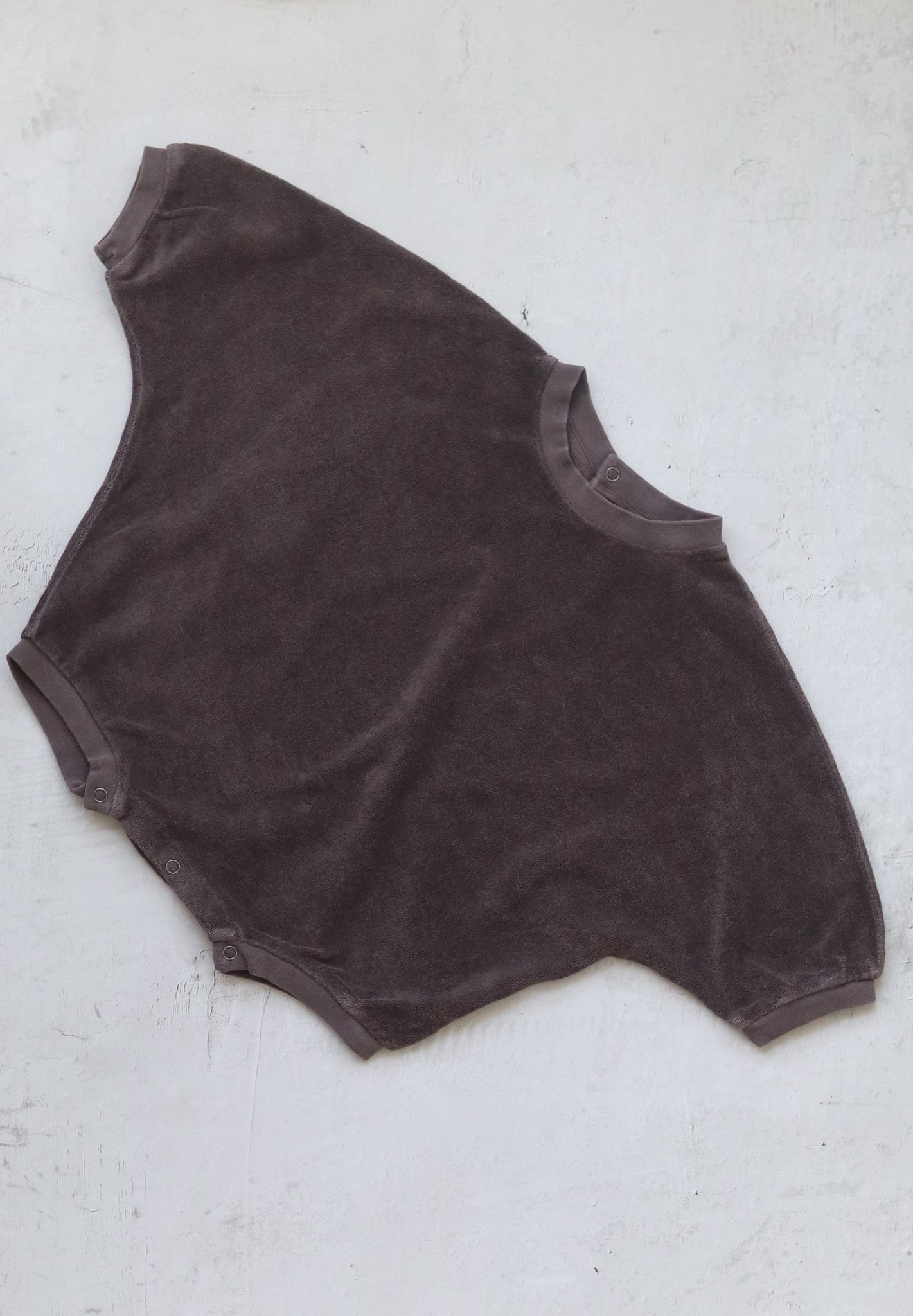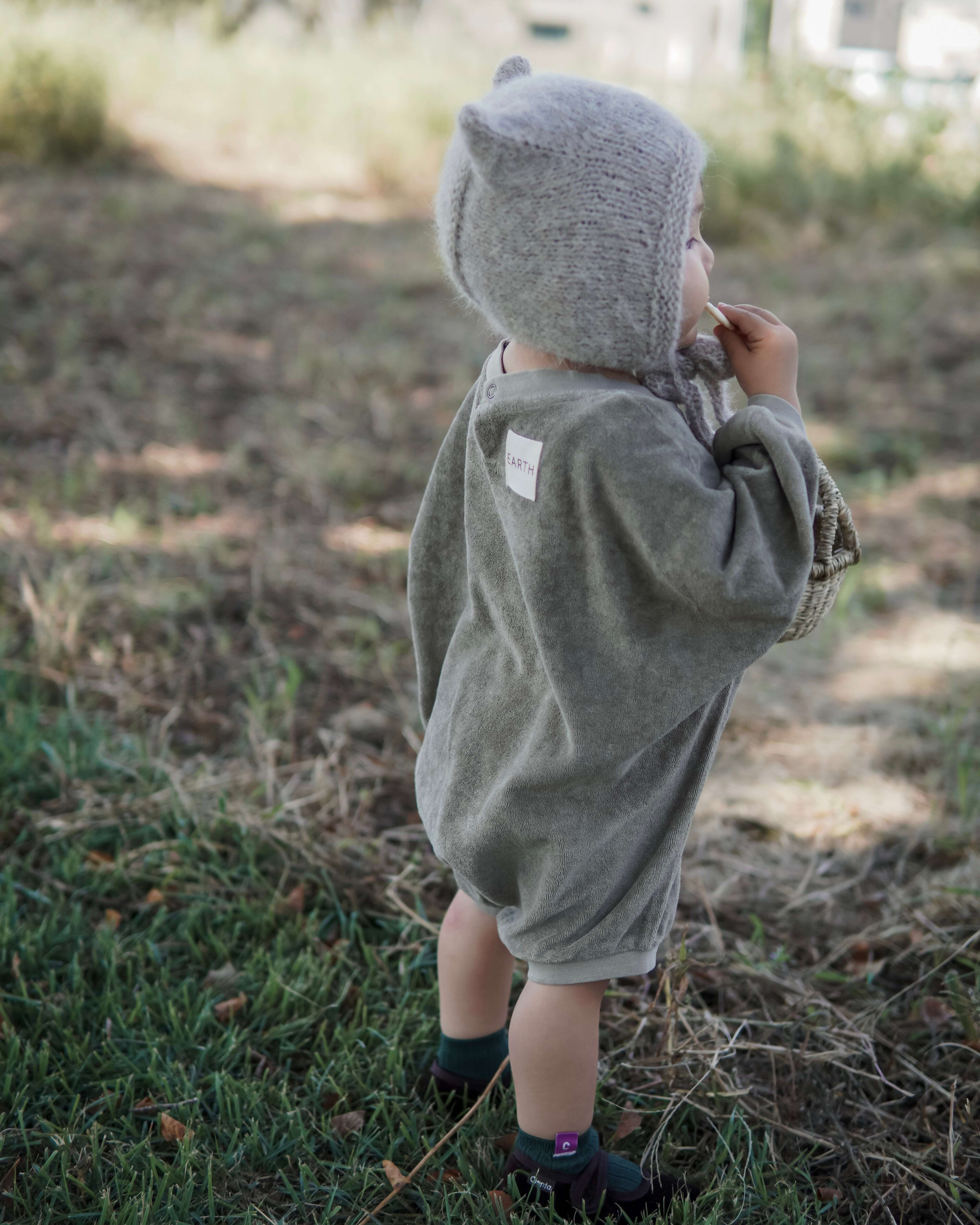 シルエットがモモンガに似ているということから、日本ではモモンガロンパースという愛称でも知られています。たっぷりとした身幅が可愛くてたまりません。生地はふわふわで肌触りも優しく、毎回少しずつ違う草木染めカラーが魅力的です。
