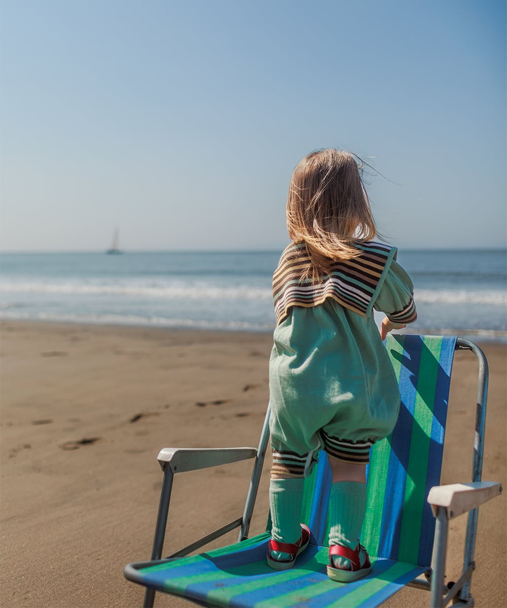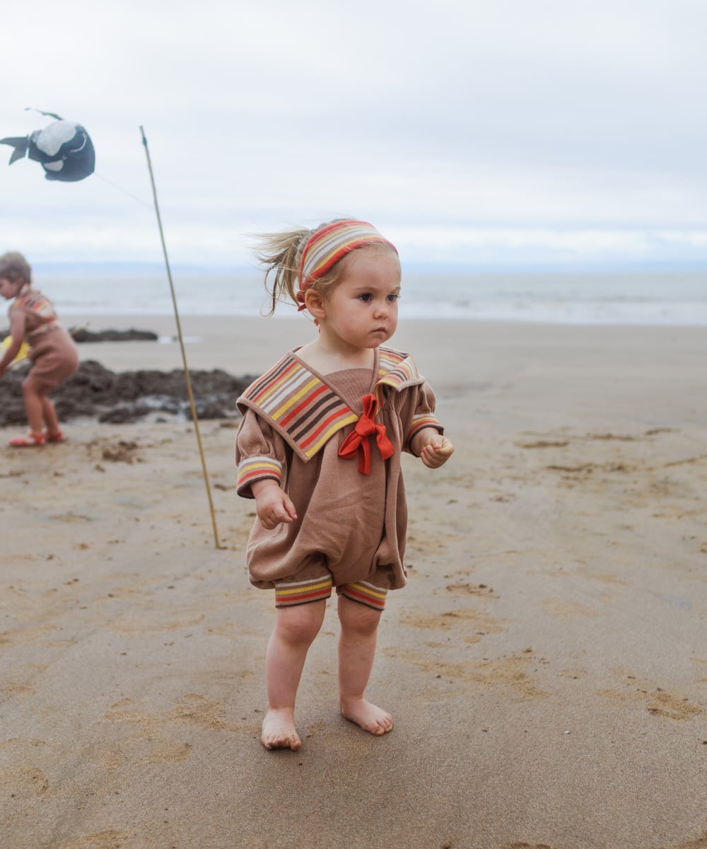 クラシカルなセーラーカラーが目を惹く、愛らしいシルエットのロンパース。