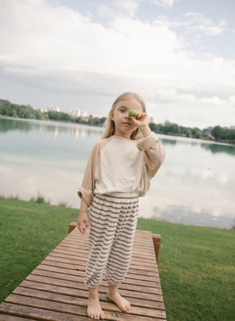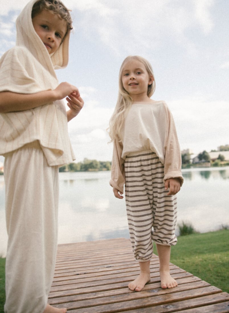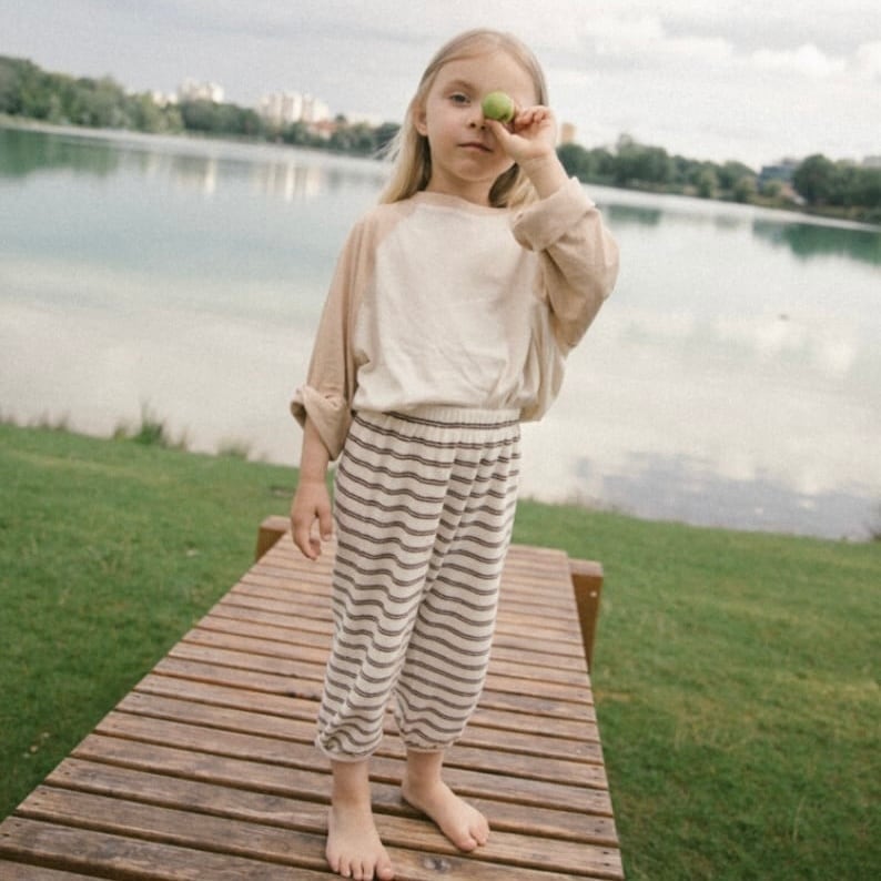 裾には自然にフィットするバンディングを施し、動きの多いお子さまでも快適に着用できるよう設計しました。全体はゆったりとしたシルエットで、お昼寝からお出かけまで一日中ストレスなく過ごせる着心地です。ウエストは総ゴム仕様で、着脱もスムーズ。クロップド丈のトップスやタンクトップ、スウェットなど、さまざまなアイテムと合わせやすいデイリーウェアです。