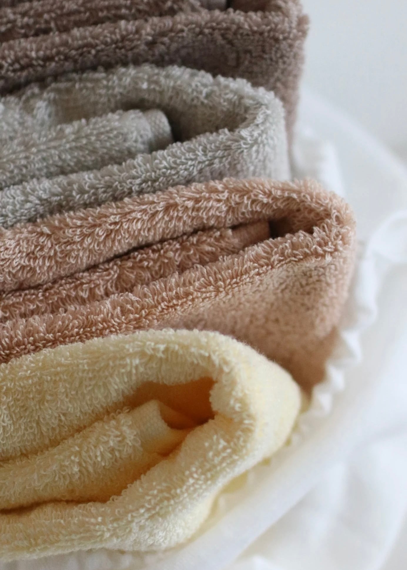 ループ付きで、保育園用の持ち物としても便利にお使いいただけます。ほどよい厚みがあり、植物染めの工程を経ることで吸水性にも優れた仕上がりです。小さな赤ちゃんであれば、ハンドタオル一枚で頭から全身までしっかりと拭くことができ、入浴時にはやさしく泡立ててボディタオルとしてもお使いいただけます。また、授乳後に肩にかけてバープクロスとして使うなど、日常のさまざまなシーンで活躍します。