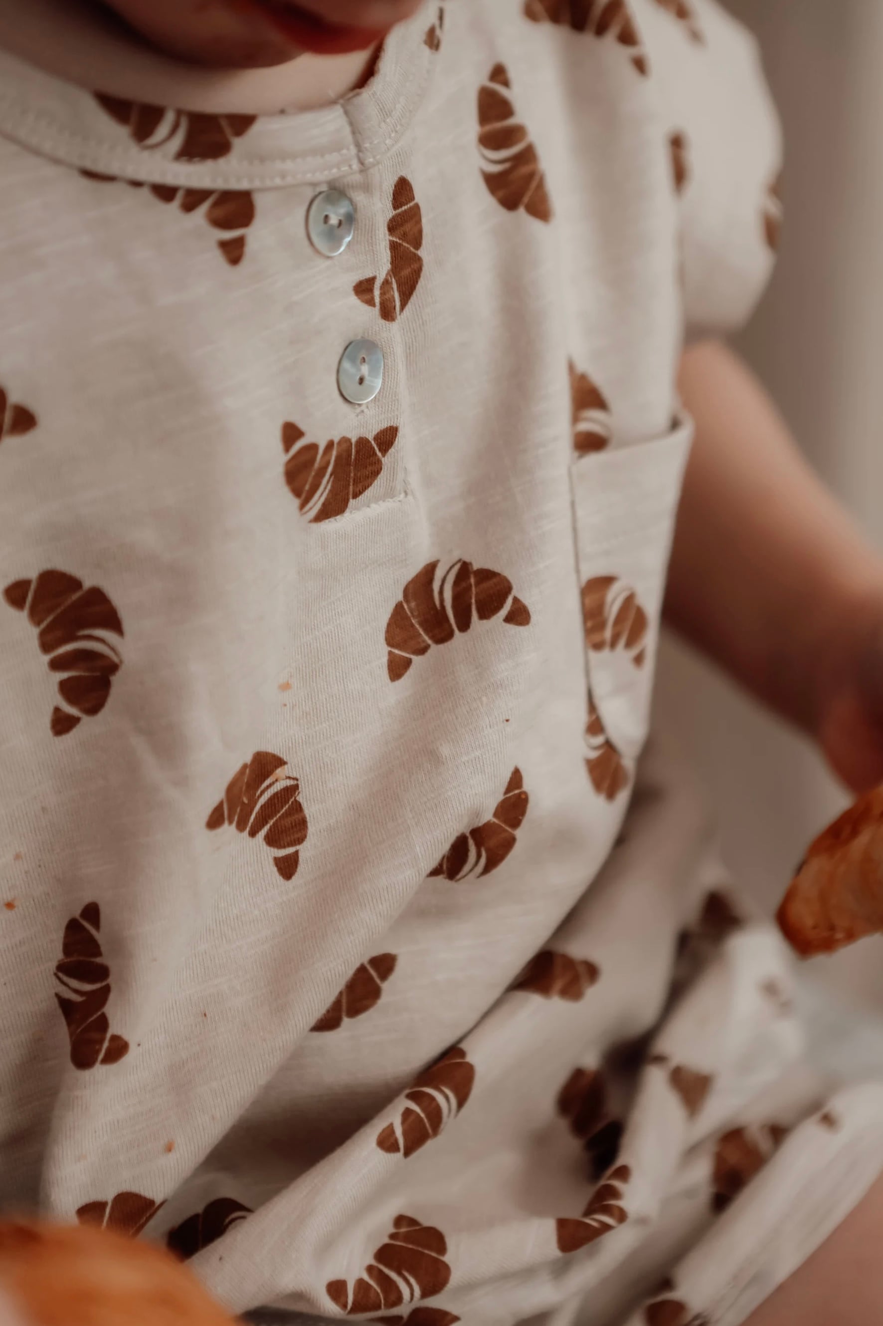 全体にクロワッサントのプリントが施されたお袖が短めのMONSIEUR MINIの定番半袖Tシャツです。 後ろ側が少し長めのデザインとなっております。 生地は柔らかくて軽いOeko-tex 100% cotton生地を使用しています。真夏も涼しく着用して頂けます。